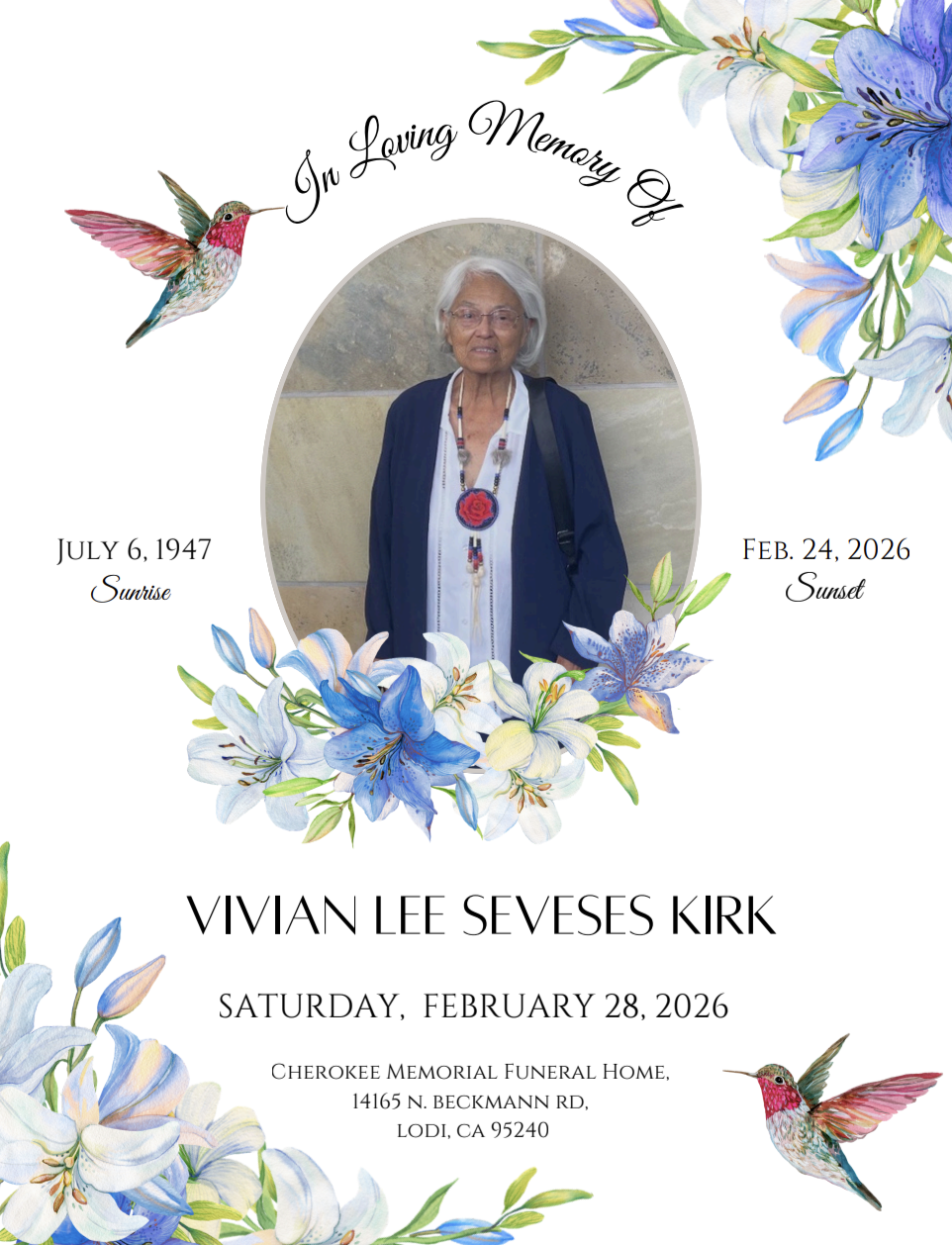 Remembering services are being held on February 28, 2026 at Vineyard Chapel at Cherokee Memorial Park, 14165 N. Beckman Rd, Lodi, CA 95240 with a viewing at 1:00 pm followed by a reception for family and friends.